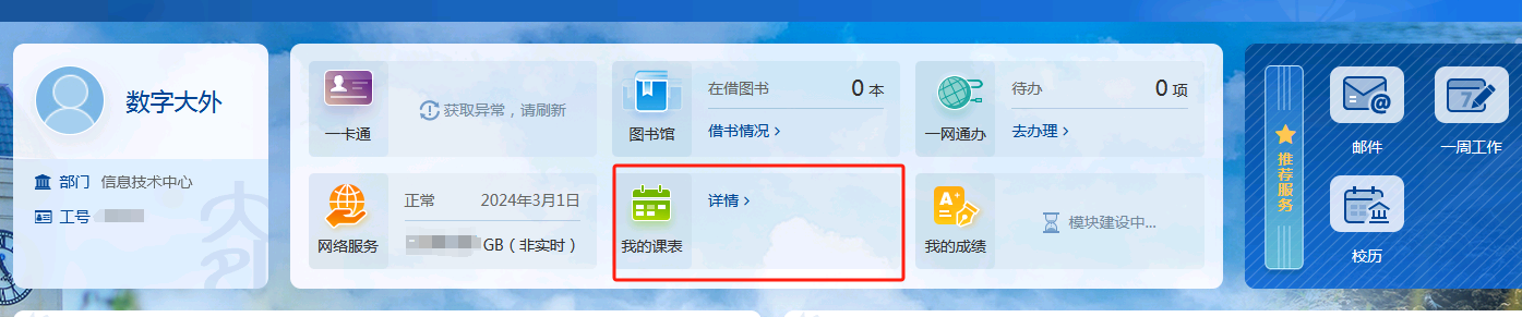 学生:登录【数字大外】后,在首页顶端的快捷入口即可直接访问【课程表】模块。